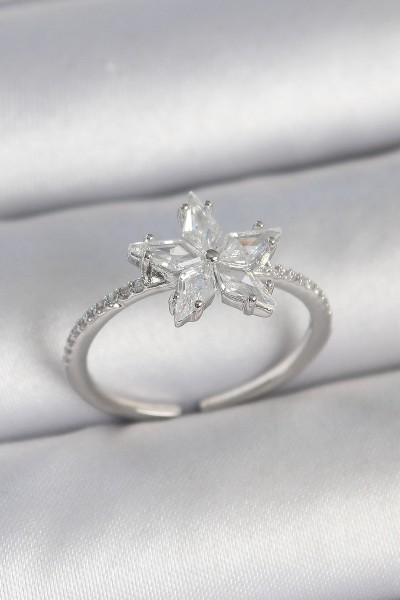 Tomris Hanım Pirinç Gümüş Renk Zirkon Taşlı Yıldız Model Ayarlanabilir Kadın Yüzük